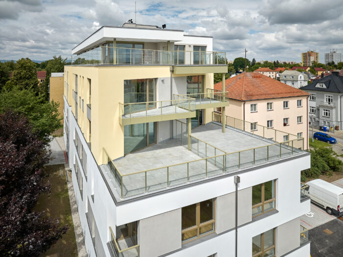 Dům nabízí byty ve standardu PREMIUM – od 1+kk po prostorné 4+kk penthousy s terasami a výhledy.