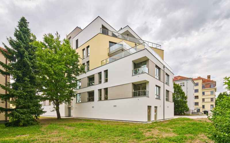 Novostavba bytového domu vlastní 6 nadzemních podlaží a 1 podzemní podlaží. Je zastřešena plochou střechou a z hlediska hmotového tvoří 3 rozdílné ustupující části. 1. – 3. nadzemní podlaží vytváří hlavní tělo a využívá plně plochu zastavitelného pozemku. 4. – 5. nadzemní podlaží ustupuje a vytváří zde prostor pro obytné terasy. Poslední 6. nadzemní podlaží vytváří hlavu budovy a dále též ustupuje pro obytné terasy. Terasy s okrasnou zelení tak bude objekt bytového domu propojovat s okolní veřejnou městskou zelení, do které je objekt dokonale zasazen.