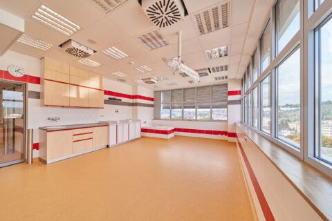 Do pavilonu K se přestěhuje dětské oddělení, oddělení porodnice, ARO, JIP, operační sály a všechny zobrazovací metody. Součástí tohoto pavilonu je 8 operačních sálů, z nichž jeden je výjimečný tím, že obsahuje přípravu pro budoucí instalaci robota, jehož pomocí (za současného dohledu týmu kvalifikovaných lékařů) budou prováděny robotické operace. Sály budou disponovat nejmodernějším systémem video managementu. Tato inteligentní platforma pro video dohled poskytuje možnosti efektivního vizuálního ověřování událostí v reálném čase, zpětného dohledávání potřebných informací v pořízeném záznamu, archivaci záznamů či zprostředkování videokonference přímo z těchto sálů komukoliv přizvanému z celého světa.